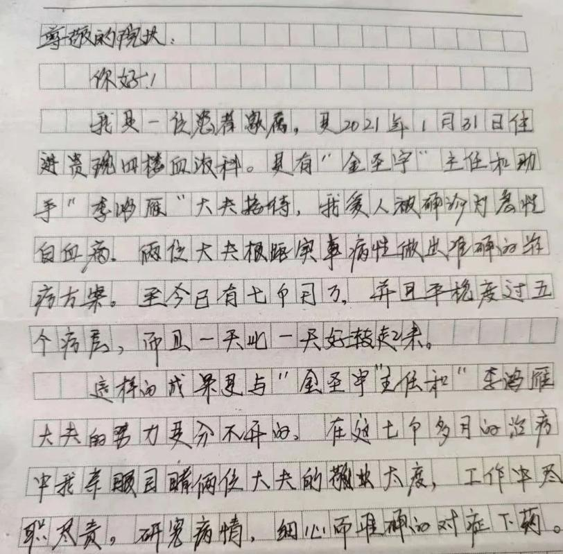 這封感謝信裏寫道:“治療期間,我們親眼目睹了金聖宇主任和李鴻雁醫生的敬業態度,工作中盡職盡責、仔細研究病情、準確對症下藥,對待患者更是耐心、細心,正是他們的用心良苦和努力付出,才讓患者的病情得到了這麼好的療效。”