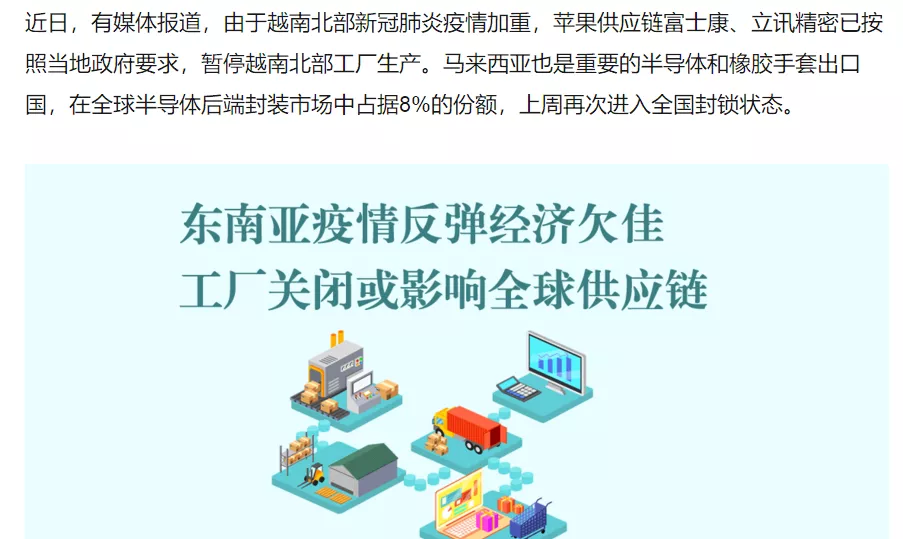 **其次,對華制裁導致的停滯與東南亞及台灣地區疫情爆發相疊加。**一片芯片從沙子變成芯片需要至少10-12周時間,其產業鏈可能分佈在全球十幾個國家,在日本或者德國把原料硅冶煉成硅片,在台灣或在韓國生產芯片,在中國大陸或者東南亞封裝測試,在韓國,中國乃至印度的電子廠中組裝成產品模組,最終再進入成品工廠完成組裝,變成我們的各種電子產品和其他工業製品。