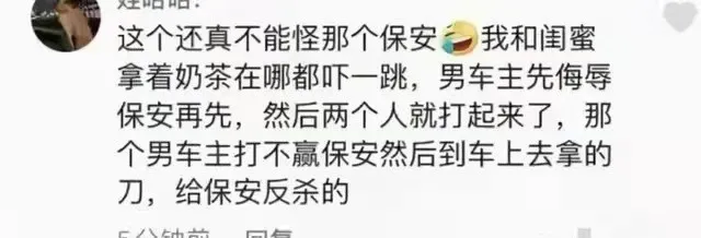 還有位疑似目擊者的女生在網上留言説:“這個還真不能怪那個保安 我和閨蜜拿着奶茶在那都嚇一跳,男車主先侮辱保安再先,然後兩個人就打起來了,那個男車主打不贏保安然後到車上去拿的刀,給保安反殺的。”
