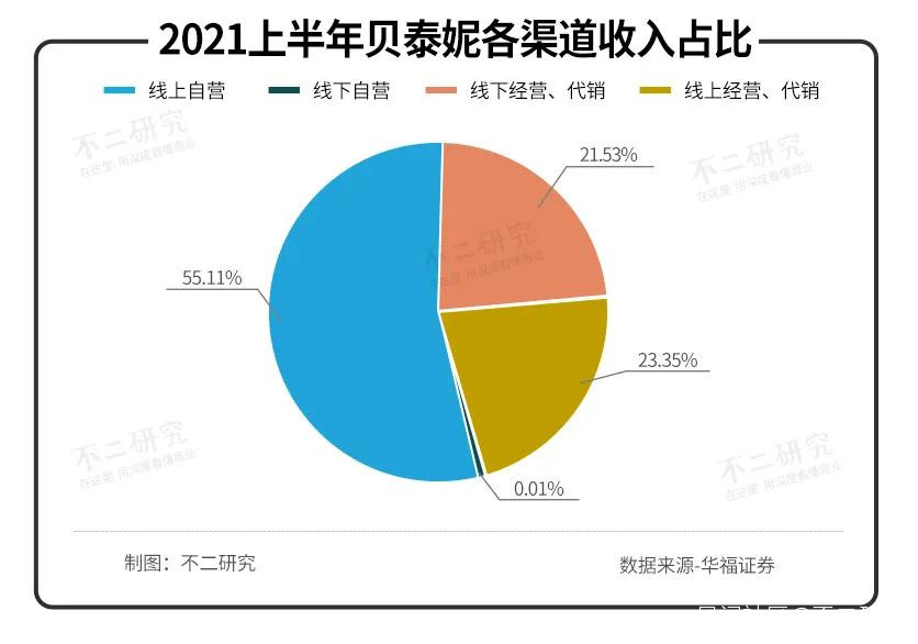 2021年上半年,貝泰妮線上渠道收入佔公司營收的78.46%;其中,線上自營和代銷分別佔公司營收的55.11%和23.35%。