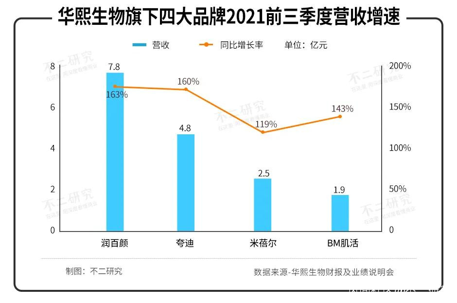 華熙生物四大品牌在2021年前三季度均取得較高增速,潤百顏、誇迪、米蓓爾、BM肌活分別實現營收7.8億元,4.8億元,2.5億元,1.9億元,同比增長163%,160%,119%,143%。