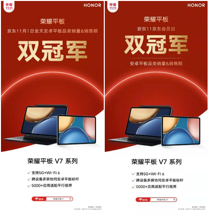 以榮耀平板V7 Pro來説,其作為旗艦平板的代表作,也作為榮耀的主打產品,集“高效的智慧化能力、旗艦性能與通訊能力、富有創造力的配件、卓越的音畫體驗”四大極致表現為一體,產品力直接拉滿,並在本次雙11斬獲天貓、京東多個主流電商平台的冠軍,大獲成功。