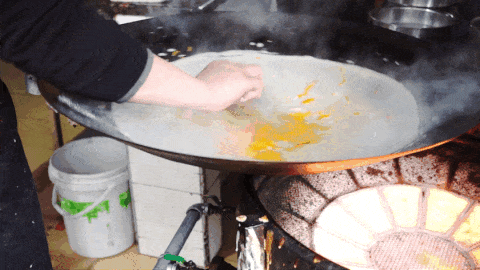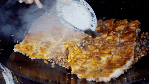 和打饢師傅離不開饢坑一樣,做豆皮也離不開那口大鐵鍋。舀一勺豆皮漿緩緩淋入鍋裏,慢慢攤開,上面再鋪上一層雞蛋液,待到雞蛋液鋪滿整張豆皮,師傅會熟練地把皮翻個個兒,然後鋪上提前蒸好的糯米飯,配上香菇,鮮筍,鮮肉等餡料,再翻個個兒,均勻地切成若干塊。