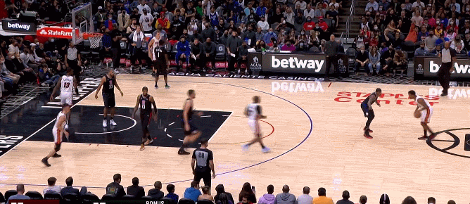 45秒,阿德巴約給洛瑞在很高的位置掛掩護徹底擋住了喬治,祖巴茨只能在三分線等着洛瑞,雷吉已經從左側過來協防了,但洛瑞直接突右手到內線迎着祖巴茨打進2+1;