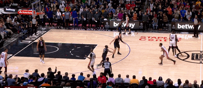 喬治主要是防守:先是從鄧羅手裏摳下一個前場板,然後命中三分;再連續兩個回合攔下阿德巴約的攻筐,一次造成進攻犯規,一次高高躍起正面攔截,這同樣也顯示出阿德巴約最後在進攻端的乏力。