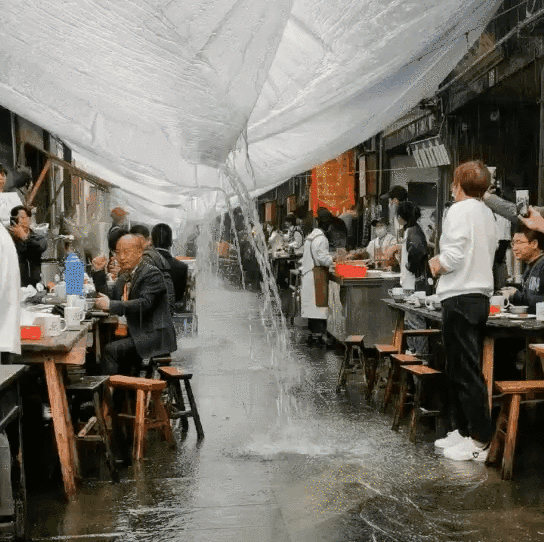 而在樓上的食客,突遇屋頂漏水,他沒有大喊大叫,只是抬頭看了一眼,淡定地移了一下椅子,然後繼續喝着自己的早茶。