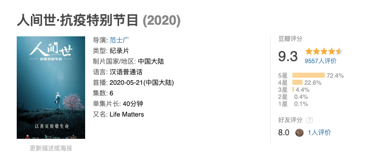 2020年紀錄片《人間世》系列推出了抗疫特別節目,這系列聚焦武漢與上海兩地病區的醫護與患者們,雖然依舊有觀眾認為這系列太過煽情,但是該節目在豆瓣評分達到了9.3分。