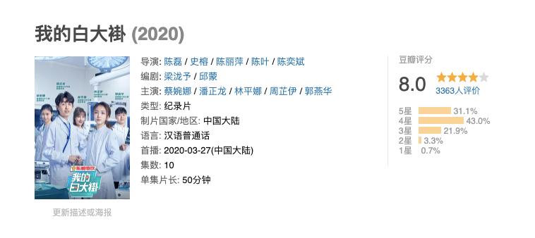**另一方面則是因為醫療題材主流的敍事方式。**大部分醫療作品都習慣以羣像來展現故事,以單元敍事完成醫生形象的塑造,電視劇有足夠的空間與篇幅進行鋪陳。國內市場上雖然優質的醫療劇集並不多,但是行業一直沒有放棄耕耘這塊領域。