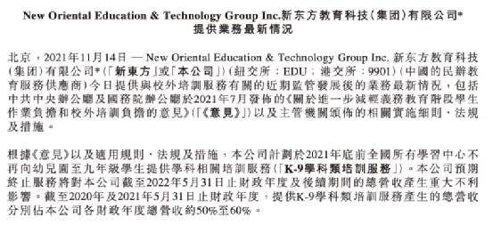 11月15日,新東方在港交所發佈公告稱,公司計劃於2021年底前停止全國所有學習中心的K-9學科輔導服務。截止目前,K-9服務的收入約佔公司每個財政年度總收入的50%至60%。