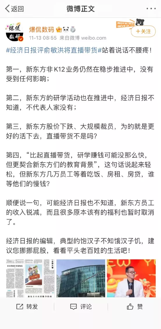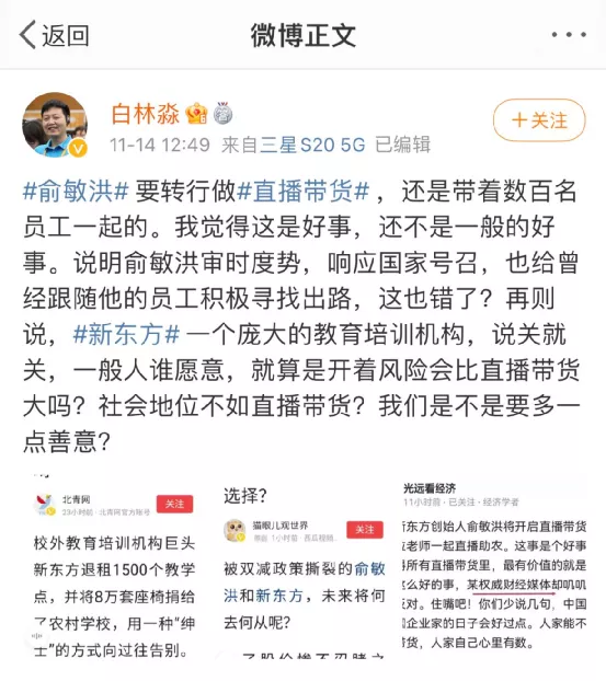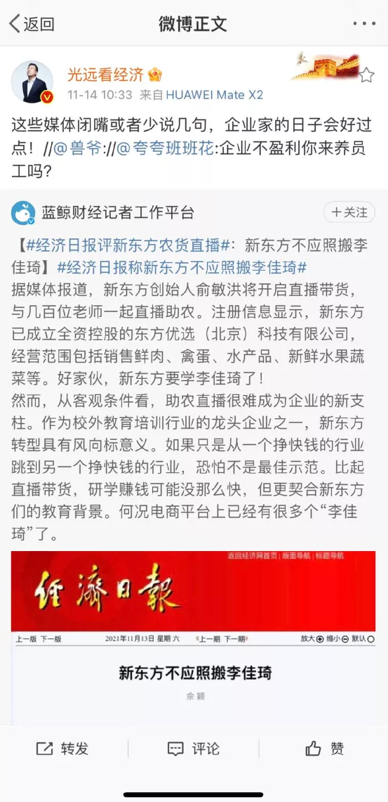 新東方如果直播帶貨的話,還是要向李佳琦或者薇婭這樣的人物去取經,向他們學習,而記者主要是考慮到新東方原來對這個領域不熟悉,如果這樣的直播帶貨,可能對新東方來説不是一個最好的選擇。而且,我們又宣佈要做農產品,可能風險更大,其實給我們一個非常善意的提示。俞敏洪還表示,並不太認同文章提到的“從一個掙快錢的行業跳到另一個掙快錢的行業”。其實商業模式不存在快錢和不快錢,教育領域做起來也挺艱難的,很多教育公司原來都是賠錢的。直播也是不容易的。我知道薇婭、李佳琦一直播就是十幾個小時甚至20個小時,沒日沒夜地選品,沒日沒夜地努力,所以其實沒有一項行業是好做的。
