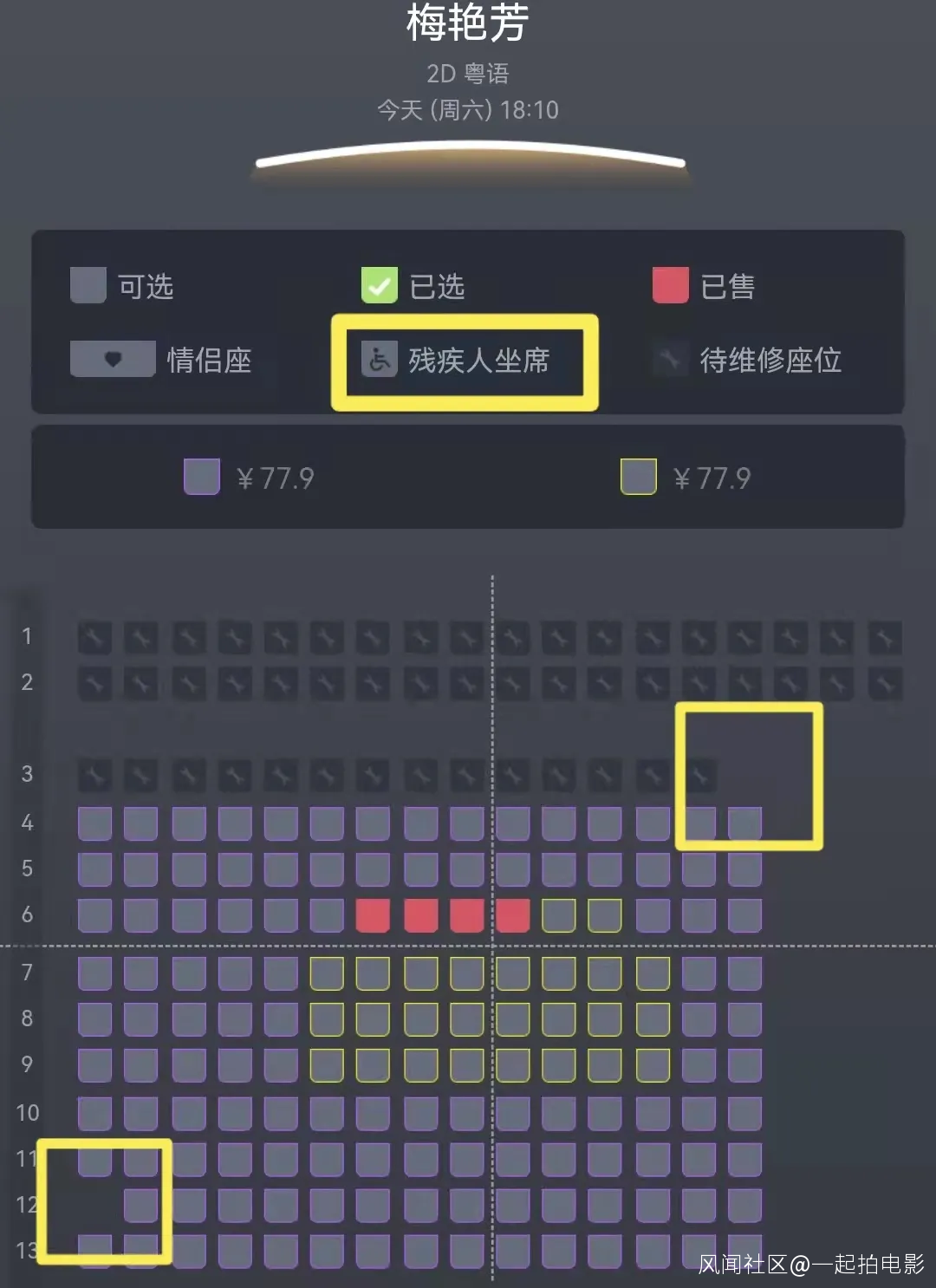 就此,拍Sir查看了國慶大片《長津湖》和最新影片《梅豔芳》在不同影廳下的座位情況。以具備標準化建設的萬達影城為例,雖然在選座圖例中顯示出了“殘疾人坐席”一項,但實際座位圖中卻並未見之;而無論是大廳小廳,應屬輪椅座的“缺口位”都被設置在了第一排或靠過道的犄角旮旯位。