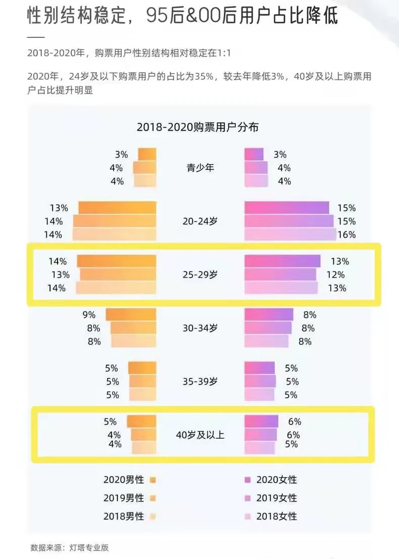 與老年人數量同向增長的還有他們的智能手機普及率。由此,老年用户的網絡電影購票率也得到了提升。據燈塔專業版發佈《2020中國電影市場年度盤點報告》,儘管20-29歲青年人仍是電影購票的主力,但無論男女,40歲及以上購票用户佔比也在連年提升。