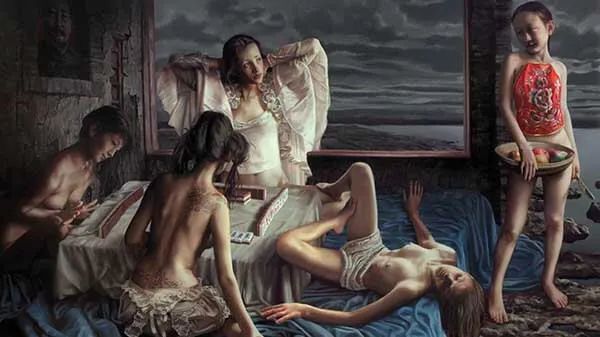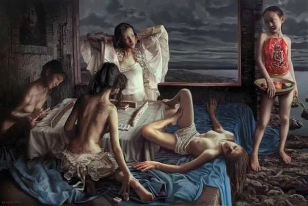 這幅名為《北京2008》的作品描繪了四名年輕女子打麻將的情景。