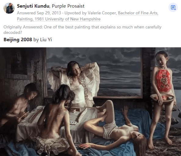 我至少看過6種關於這幅畫的不同的解釋,其中3種與國際關係和中國政治有關。但我從來沒見過畫家本身對這幅畫的解讀。