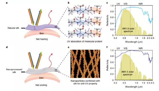 天然絲綢由於其蛋白質成分,在紫外線(UV)區顯示出高吸收率。然而,紫外線區蛋白質的固有吸收阻礙了天然絲在陽光下達到淨冷卻。於是,研究人員通過分子鍵合設計和可擴展偶聯試劑輔助浸塗方法探索了絲的納米加工。