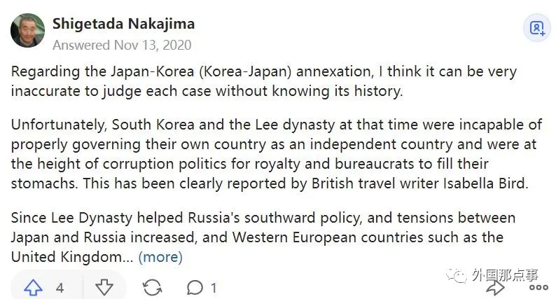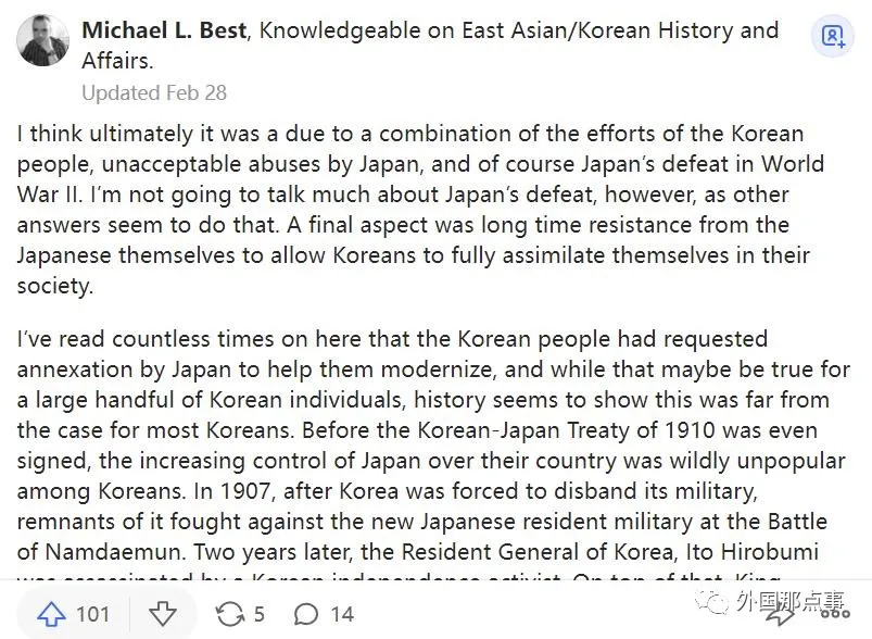 熟悉東亞/韓國曆史的美國網民 Michael L. Best 説: