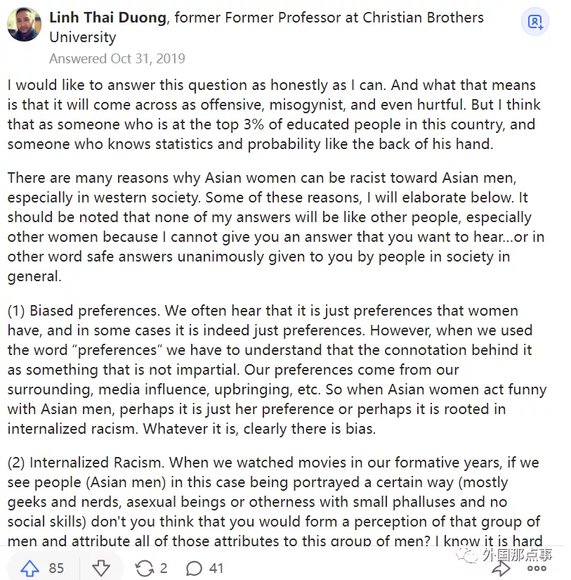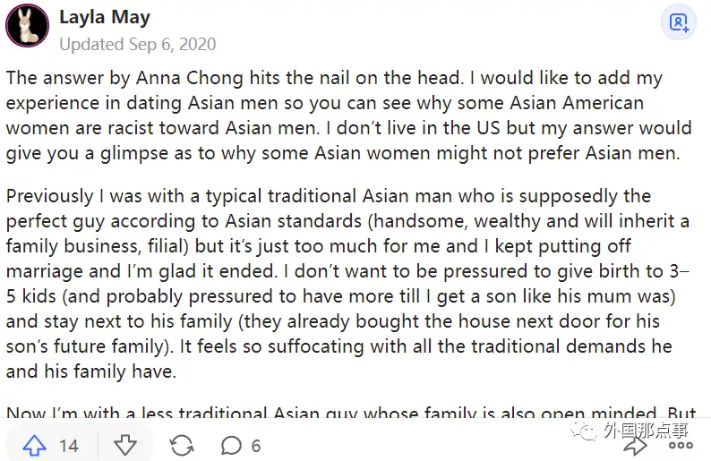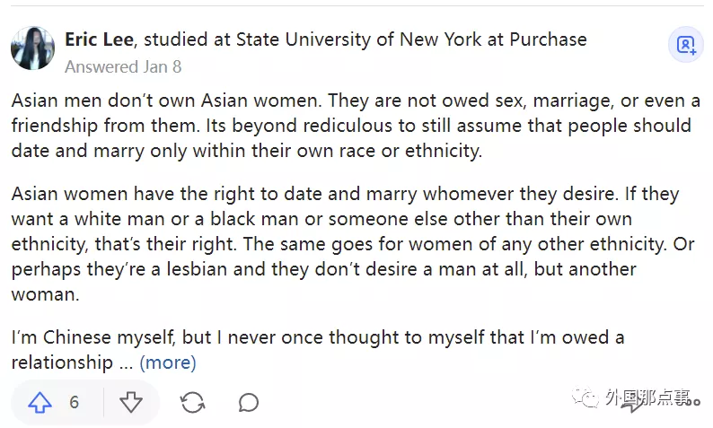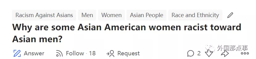 這樣的問題在外網也有很多討論,其中一個話題是:為什麼一些亞裔美國婦女對亞裔男子有種族歧視?