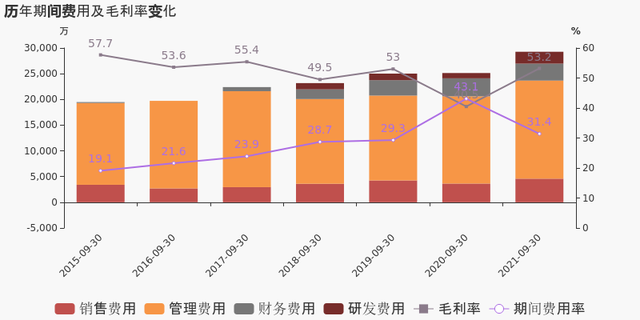 2021年前三季度共計營業總成本7.4億元,相較去年前三季度上漲22.31%。第三季度營業成本4.4億,同比增長25.8%,低於營業收入59.8%的增速,導致毛利率上升12.6%。