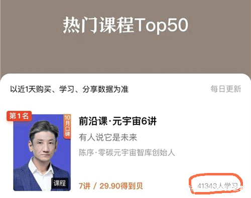 你能想象嗎,定價僅29.9元的《元宇宙6講》網課,在羅振宇的得到App上,截止11月11日,已賣出超4萬份,總營收保守估計超過120萬,無爭議優勢位列熱門課程的TOP 50第1名。