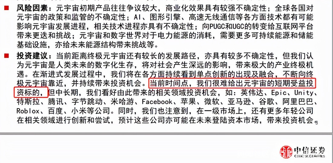 此外,據中信證券研報顯示,“中長期,我們看好由此帶來的相關領域投資機會,如:英偉達、Epic、Unity、特斯拉、騰訊、字節跳動、米哈遊、Facebook、蘋果、微軟、亞馬遜、谷歌、阿里巴巴、Roblox、百度、小米等公司。
