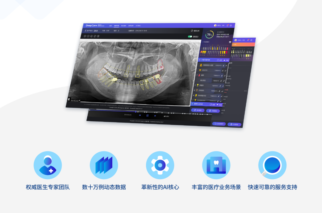 DeepCare是一家全球領先的專注於口腔人工智能應用的醫療科技公司。研發團隊彙集了來自達特茅斯學院、加州大學洛杉磯分校、馬里蘭大學、清華大學、北京大學、浙江大學等知名機構的全球計算機科學精英和口腔醫學專家。團隊將尖端的人工智能技術與口腔醫療業務應用場景相結合,開發出創新的口腔人工智能產品。