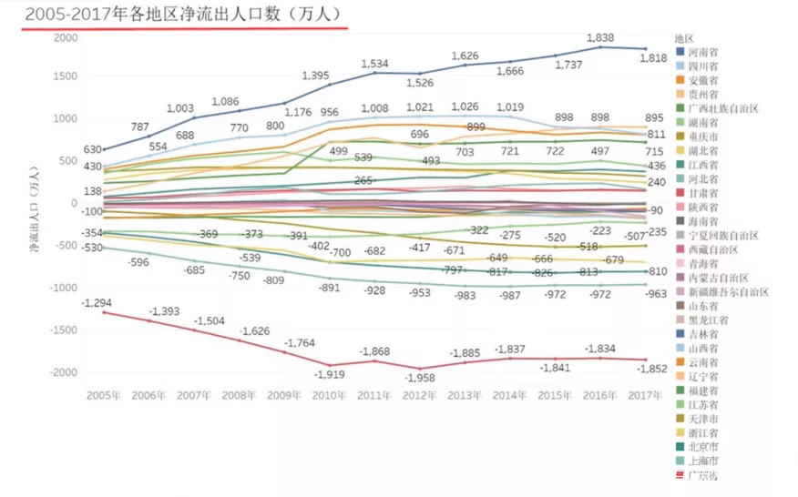 從這張“2005年—2017年全國各地區淨流出人口數”的統計中我們可以發現: