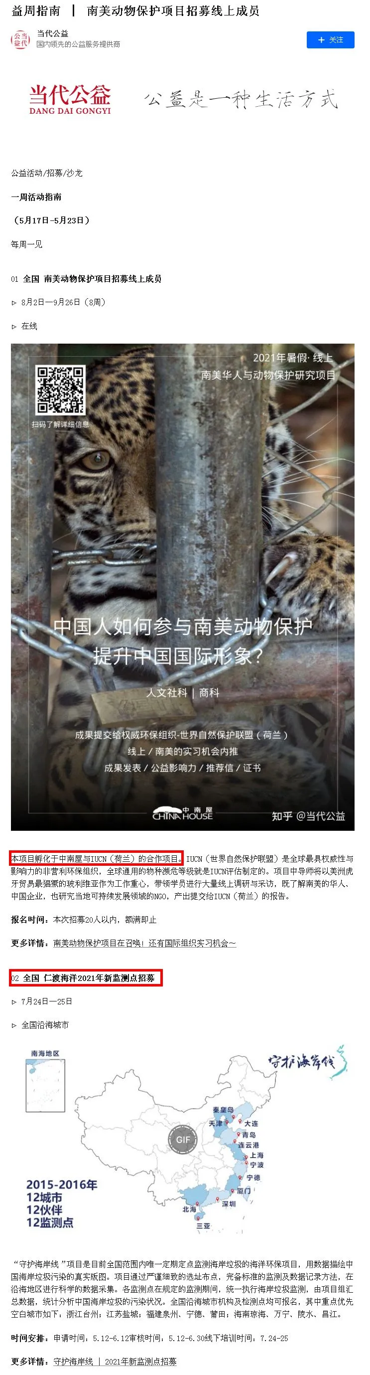 就在今年五月,他還在網上繼續招聘“南美動物保護”線上成員,繼續拉大旗做虎皮,實則又是騙年輕人和他們父母的錢。注意看,在中南屋廣告的這則之後,是一家位於浦東,名叫“仁渡海洋”的NGO組織,2021年11月02日,央視報道,上海某NGO以撿海灘垃圾為名,長期在我軍港附近從事間諜活動。
