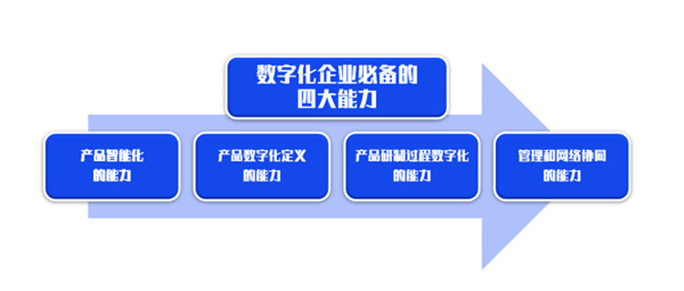 綜上,數字化企業必須具備的四大能力:第一,產品的智能化能力,把計算機軟硬件配合在一起,嵌入到產品內,提升傳統產品的水平和能力,這是產品本身內部的能力;第二,產品的數字化定義能力,即產品數字化設計能力;有了數字化設計的模型,將模型延伸到產品的研製過程,就形成了第三大能力,產品研製過程數字化的能力;最後,為了能夠實現產品的數字化定義能力和產品研製過程數字化的能力,就必須掌握管理協同和網絡協同能力。