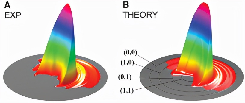在2011年的時候,現代化學對HD+OH→H2O+D的反應進行了精細的研究[2]。在這個研究中,研究者們讓HD分子束和OH分子束在真空環境中進行碰撞,然後查看D產物在空間的分佈情況,如圖5所示。實驗和理論的結果一模一樣。通過分析產物的空間分佈,研究者們可以推測出HD和OH是如何進行碰撞的,比如在反應過程中,HD和OH之間相對角度是什麼樣子的,還可以研究HD和OH之間相對速度如何影響反應。