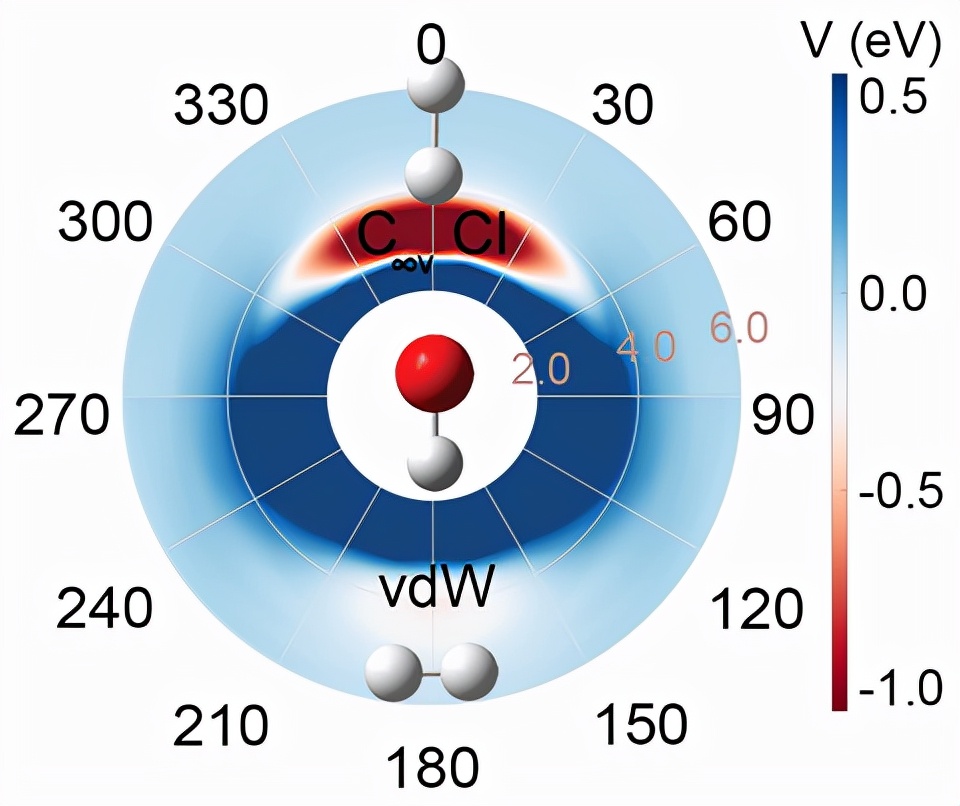 上面的這兩個場景介紹的有點抽象。如果從另外一個角度來看這個拍攝場景,可以更加容易看明白。圖8展示的是第三層樓的俯視圖。為了便於説明,我們假設把OH(A)固定在空間不動,然後讓H2去接近OH(A)。不難想象,H2可以有多種方式去接近OH(A)。H2可以去接近OH(A)中的O原子,也可以去接近OH(A)中的H原子。而H2本身也可以用不同的角度去靠近OH(A),可以讓H2平行於OH(A),也可以垂直於OH(A),或者其他任意的角度。另外,OH(A)和H2可以不在同一個平面內,他們的鍵長也可以伸縮。圖中不同的顏色表示的是不同的高度(能量)。紅色表示的是低能量,而藍色表示高能量,白色表示的是中間能量。圖中的半徑表示的是OH(A)和H2之間的距離,而角度表示的是H2相對於OH(A)的角度,H2的角度是按照最低的能量來選擇。在H2接近OH(A)的過程中,H2會被引導到兩個低能量的區域:紅色的線性CI (