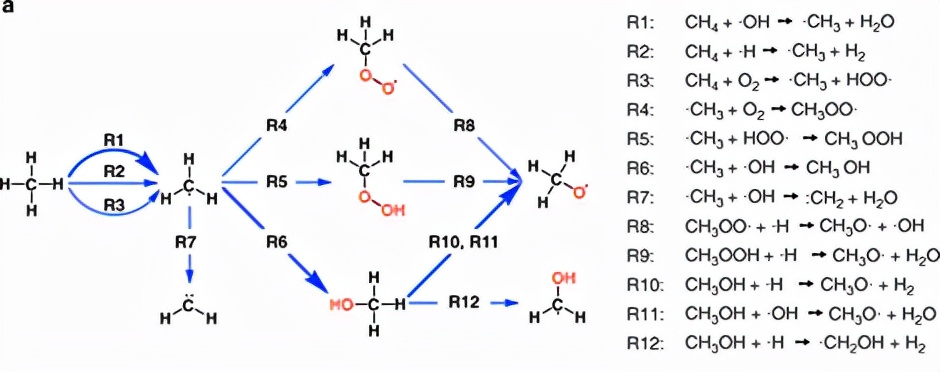 她還特意強調説反應式配平了。當我追問CH4、O2、CO2和H2O長什麼樣子的時候,她開始有點懷疑自己對這個反應的認知了。然後,我跟她説,這個反應非常複雜,但她卻不相信。於是我給她看了Nature communications上最近的一篇文章中的圖[1]:
