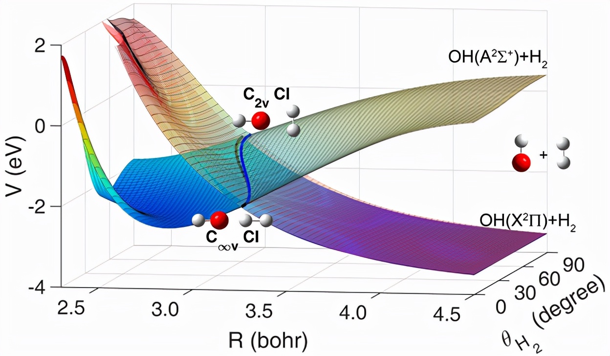 分子中的電子像一團雲籠罩在原子核周圍。由於電子的質量比原子核小几千或者幾萬倍,即使原子核處於運動之中,電子總能迅速的調整電子雲的分佈。相對於電子的迅速調整,原子核似乎是靜止不動的。原子核和電子運動的這個特點,讓我們能夠分別來計算電子和原子核的運動。這就是在理論計算化學中經常採用的“玻恩-奧本海默近似”。但是在某些特定的原子核位置,電子和原子核運動之間會產生強烈的相互影響,這正是OH(A)+H2碰撞中精彩的部分。具體將在下面詳細介紹。