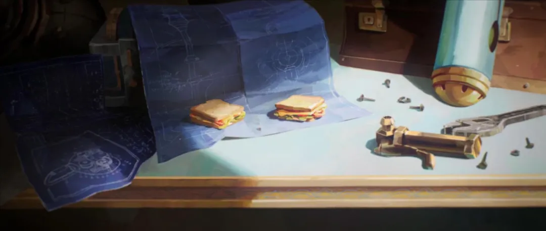 比如壓在三明治下傑斯的電子炮設計圖,對應遊戲中傑斯的武器;