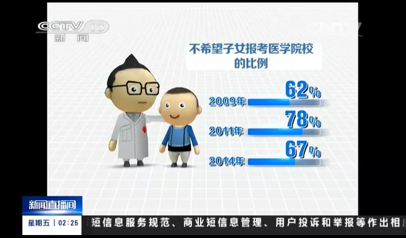 根據2015年的《中國醫師職業狀況白皮書》公佈的調查數據,醫生不希望子女報考醫學院校的比例一直很高。