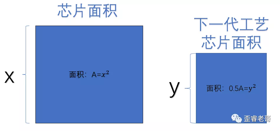 如果上一代工藝芯片面積是1mm2,在新工藝上,面積就是新工藝的一半,也就是0.5mm2。