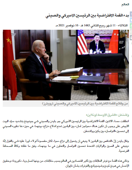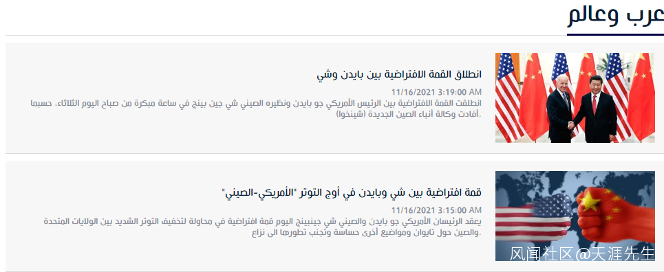 中美元首視頻會晤舉世矚目,剛看了幾個阿拉伯世界的新聞網站,埃及的《金字塔報》世界版塊連續發了兩條新聞,第一條為《中美兩國元首舉行視頻會晤》,發佈時間為當地凌晨3點19分(北京時間9點19分),第二條新聞發佈時間為當地凌晨3點15分(北京時間9點15分),基本上是同步關注了,第一條新聞援引的是新華社的消息,並對舉行會晤的背景進行了介紹,包括兩國在新冠疫情起源、涉港涉疆涉台上存在分歧,氣候變化仍是雙方可能合作的領域,剛結束的十九屆六中全會讓中方更有底氣,而美方剛通過基建法案,但也因為內耗和高通脹率使得民主黨中期選舉前景不樂觀。雙方關係改善有助提振市場行情,但世界範圍內的通脹可能會讓提振作用打折扣。第二條新聞則對近一段時間雙方有關通過會晤降低戰略對抗風險的相關表態進行了報道,其中提到美方消息人士表示,會晤於美國時間週一晚上19點45分開始,可能持續幾個小時。