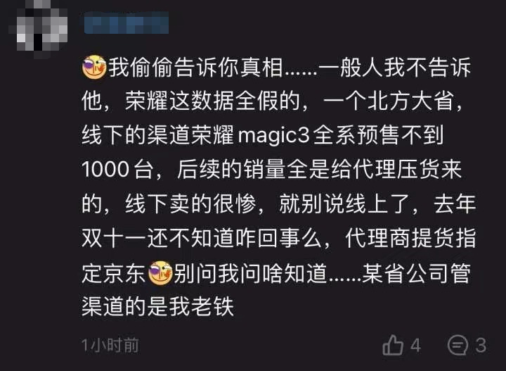 在一篇討論榮耀第三季度增速的帖子下,一名ID名為“説唱數碼”的貼吧網友透露自己朋友是一家省公司渠道管理,他表示:“一個北方大省,線下渠道榮耀Magic3全系預售不過1000台,後續銷量全靠代理商壓貨。”
