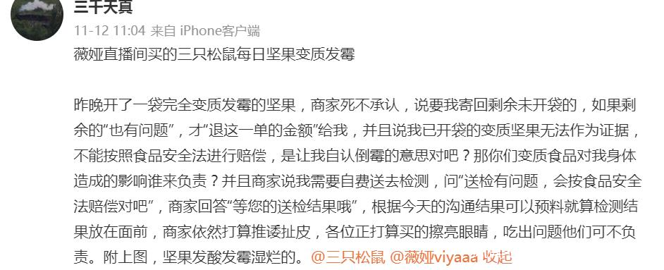 2021年11月12日上午,微博用户“三千天真”發起投訴稱在薇婭直播間購買的三隻松鼠每日堅果變質發黴,並且附上了實拍圖片,同時@三隻松鼠官方賬號和@薇婭的個人賬號,不過,由於該用户粉絲量極少,在12日當天並未掀起任何風浪。