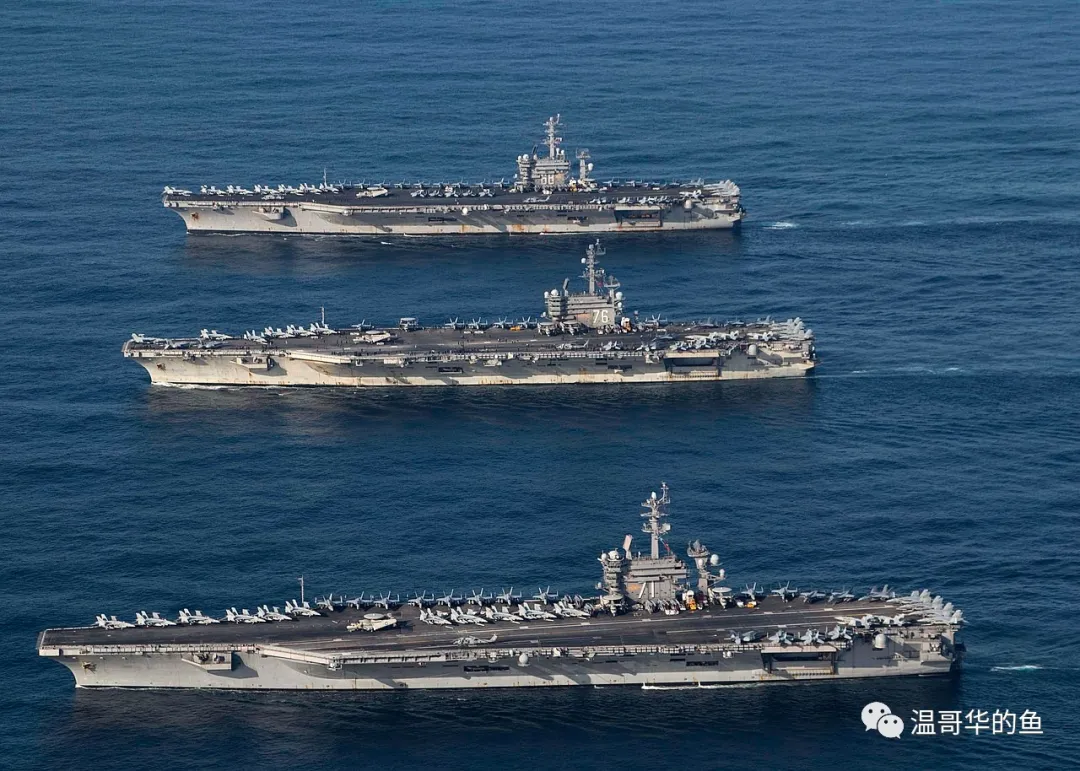 > 由近到遠分別為“羅斯福”號(1986年服役)、“里根”號(2003年)和“尼米茲”號(1975年)