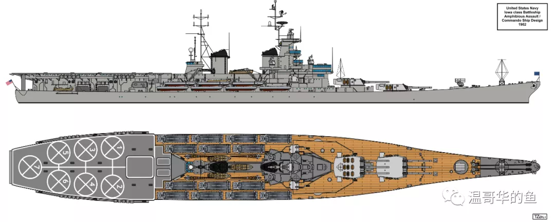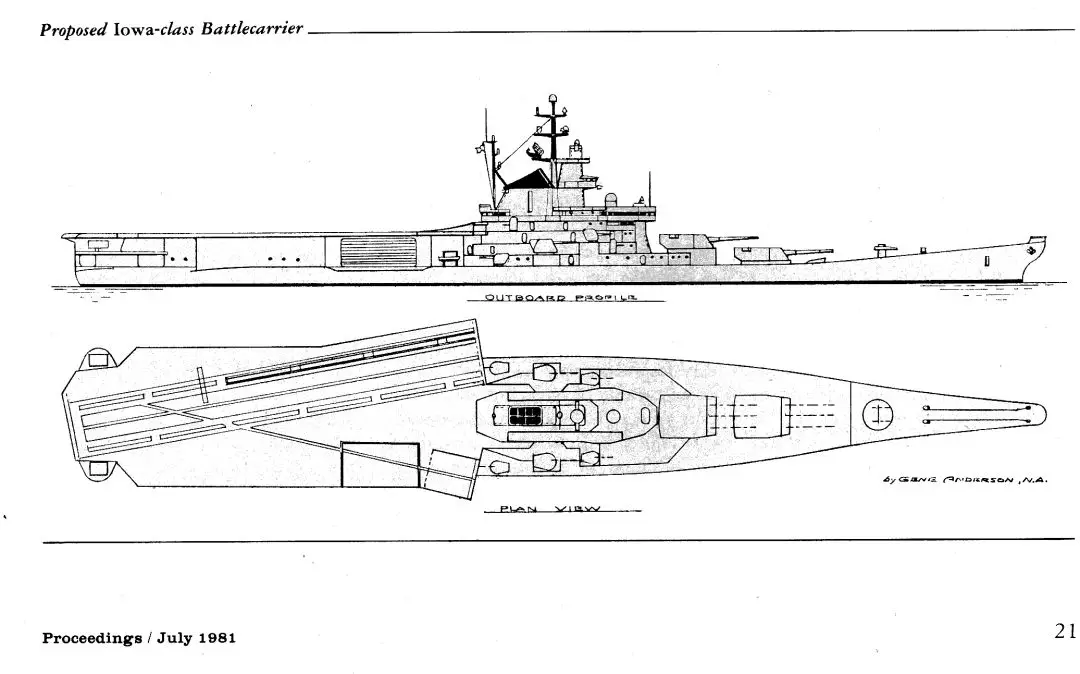 1980年裏根總統上台後推行600艦海軍計劃,為了對抗蘇聯新入役的“基洛夫”級核動力巡洋艦,決定重新啓封全部4艘戰列艦並進行了大規模的現代化改裝。美國海軍考慮了多個改造方案,馬丁·瑪麗埃塔公司提出拆除後主炮,在後甲板安裝可支持12架AV-8B運作的航空設施。