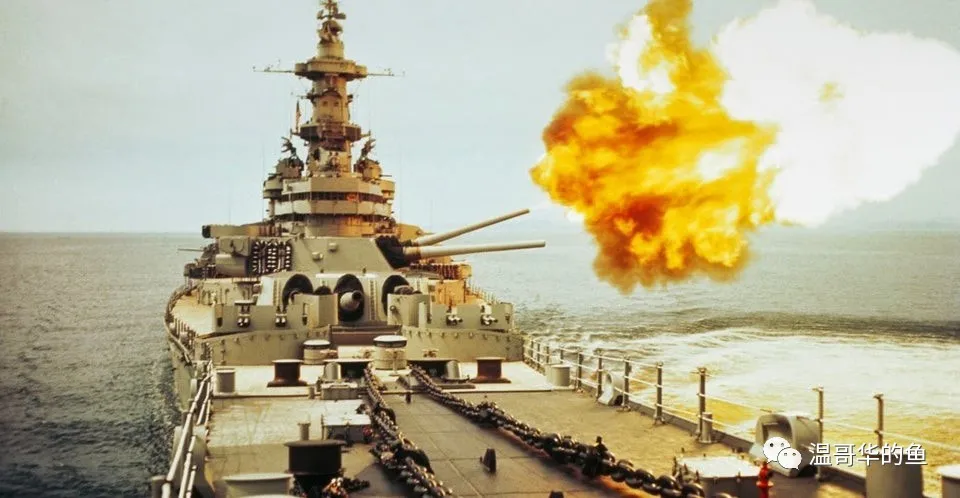 > 這張著名的照片拍攝於1984年7月1日,當天“衣阿華”號在波多黎各別克斯島附近進行炮術訓練,右舷9門主炮和6門副炮同時開火