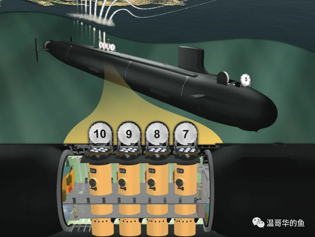 之後的10艘為Block IV型,主要改進是可維護性,大修次數從4次減少到3次,全壽命週期的戰鬥部署次數從14次增加到15次,提供了費效比。在此之後“弗吉尼亞”級將迎來重大升級,後10艘Block V型將在艇體中部插入25米長的“VPM- 弗吉尼亞載荷模塊艙段”,內置4具7聯裝VPT發射筒,加上艏部的2具6聯裝VPT,最多共能攜帶40枚“戰斧”巡航導彈,以彌補4艘“俄亥俄”級巡航導彈核潛艇退役後的陸上目標打擊能力空缺,水下排水量也將增加到1.02萬噸。
