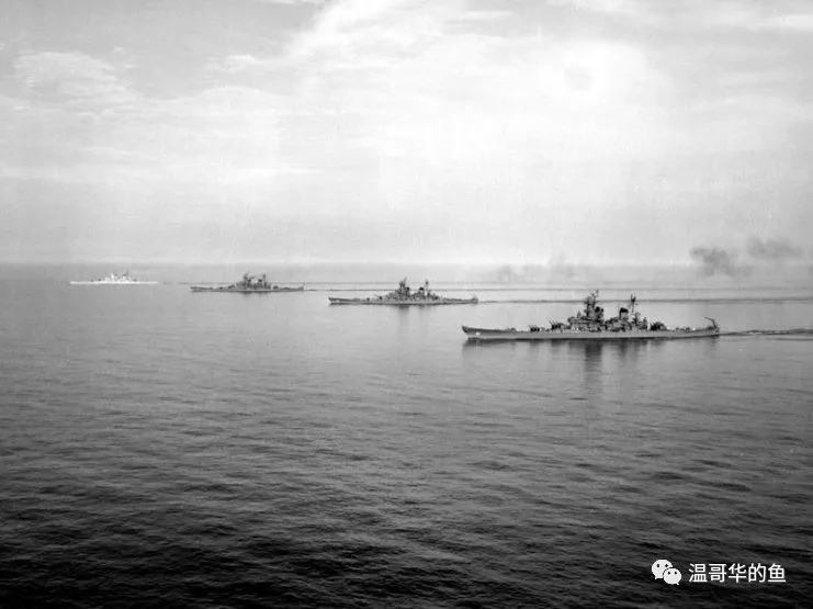 > 1954年航行在弗吉尼亞外海的第2戰列艦分隊“衣阿華”級4姐妹,從前到後分別是“衣阿華”號、“威斯康辛”號、“密蘇里”號和“新澤西”號