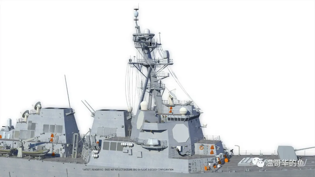 但是因為預算原因,預計採購的22艘Flight III中,前11艘的X波段雷達只能配備機械旋轉的SPQ-9B單面陣,後11艘才會是全固態的AMDR-X三面陣,滿載排水量將增加到9753噸。
