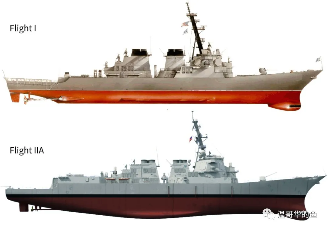 > 左側為Flight I型DDG-59“拉塞爾”號,右側為Flight IIA型DDG-86“肖普”號,艉部結構差別明顯