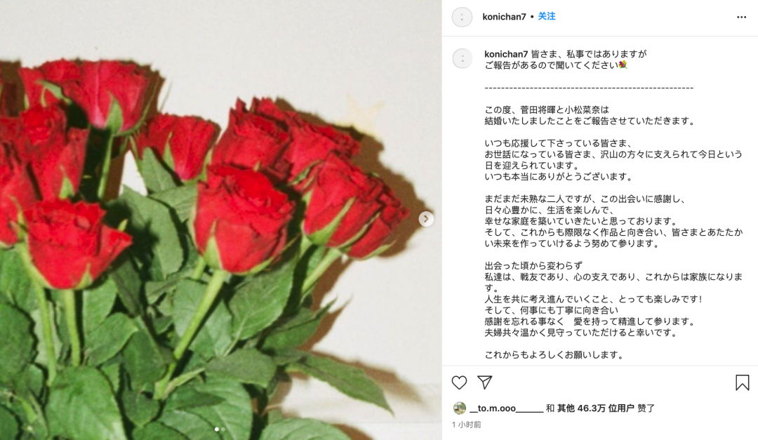 “先是官宣喜訊,在這裏向大家報告菅田將暉和小松菜奈結婚的消息。