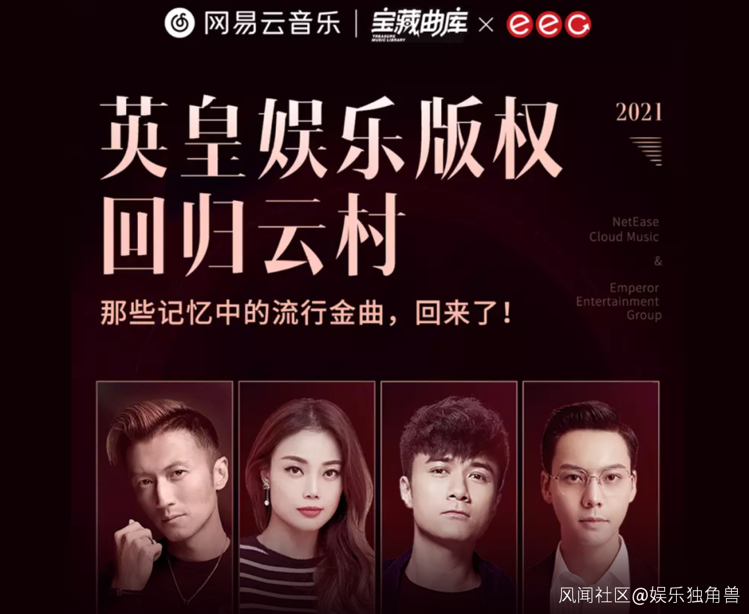 今年10月,網易雲宣佈,時隔三年之久,摩登天空重返網易雲音樂,意味着用户能夠聽到新褲子、痛仰、重塑雕像的權利、五條人、馬頔、曾軼可等歌手樂隊。11月9日,網易雲音樂APP宣佈英皇娛樂版權迴歸,旗下藝人如謝霆鋒、容祖兒、古巨基的作品重新上架。