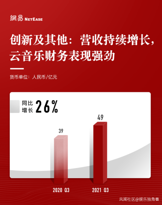 就在同一天,網易也發佈了第三季度業績報告。Q3淨收入為人民幣222億元,同比增加19%;非通用會計準則下,歸屬於公司股東的淨利潤為人民幣39億元。財報指出,網易雲音樂發力內容生態和產品創新,持續加深用户在音樂社區的參與度,財務數據表現強勁。
