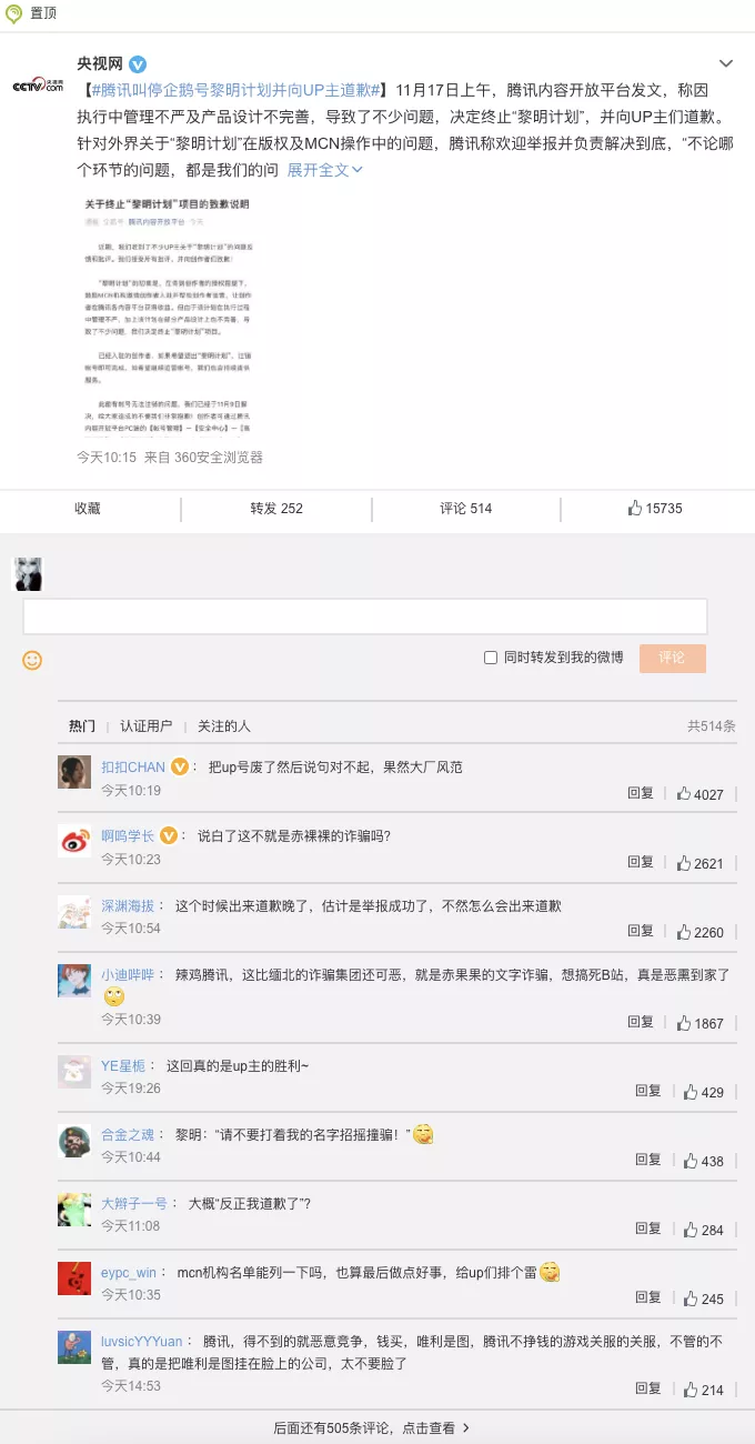 針對目前收到的對MCN機構操作問題的質疑,包括承諾了入駐金未兑現、MCN惡意舉報帳號,或在入駐時被索要創作者在第三方平台帳號和密碼等情況,騰訊表示繼續跟進處理。