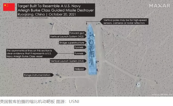 據環球網報道,近日美國海軍協會網站公佈了一組中國塔克拉瑪干沙漠的照片,這些照片來自美國MAXAR商業衞星,照片中顯示一艘巨型航母和驅逐艦赫然出現在大漠戈壁上。
